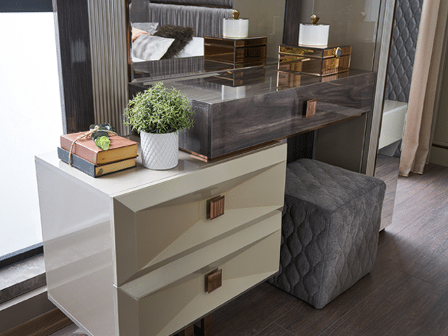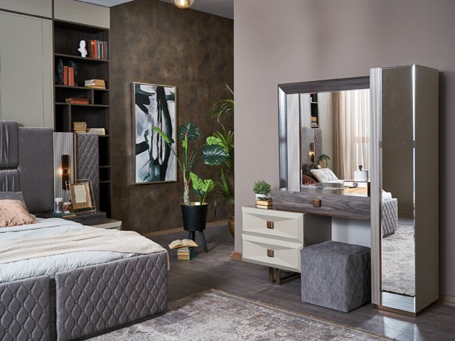 Cette enfilade, composé de 4 Eléments : 1 Lit , 2Tables de chevet ,01Commode avec miroir et d’un Armoire Portes Coulissantes saura vous charmer par sa qualité et ses finitions exceptionnelles.