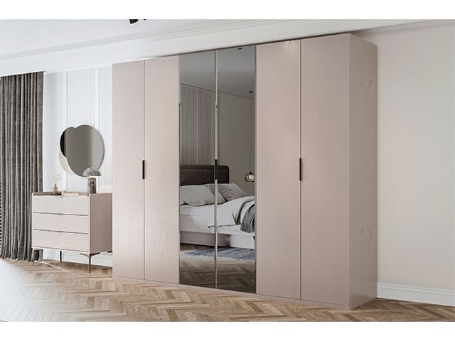 Sa finition beige apporte une atmosphère douce et lumineuse à la pièce, facilitant l’association avec différents styles de décoration. Le système de portes battantes permet un accès simple et direct aux espaces de rangement, favorisant une organisation claire et efficace des vêtements et accessoires.