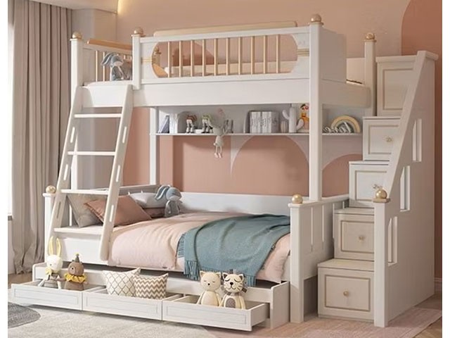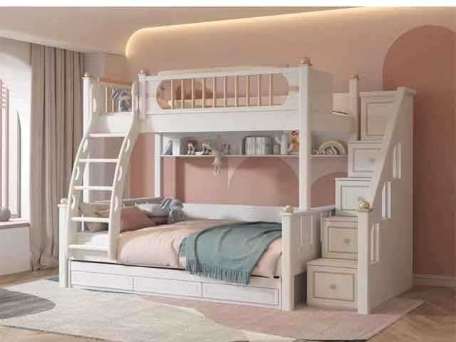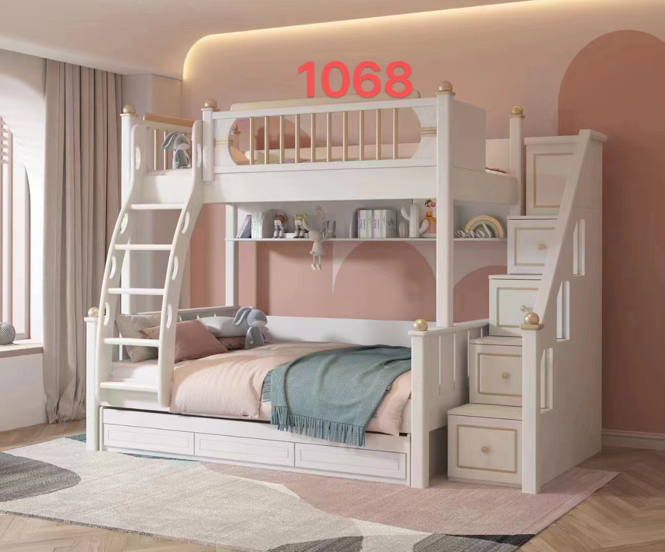 Cet ensemble de chambre pour enfant, référence 1068, propose une configuration superposée optimisée, idéale pour deux couchages ou pour maximiser l’espace dans une chambre d’enfant. Le mobilier arbore une finition élégante blanc / doré, apportant une touche raffinée et lumineuse à la pièce.