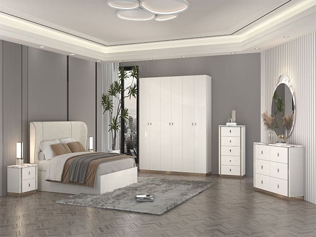 Cette chambre à coucher convient aussi bien aux logements résidentiels qu’aux projets d’aménagement locatif. Elle est destinée aux utilisateurs recherchant un mobilier fonctionnel pour organiser leur espace nuit.
