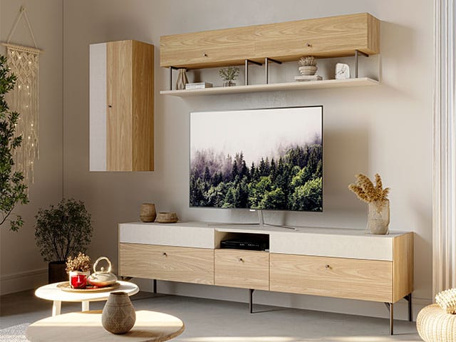 Le meuble TV CANELA est conçu pour répondre aux besoins d’aménagement des salons modernes. Avec ses dimensions de 2200 mm de longueur, 515 mm de profondeur et 120 mm de hauteur, il accueille confortablement les téléviseurs de grande taille ainsi que les appareils multimédias tels que décodeurs, lecteurs ou consoles.