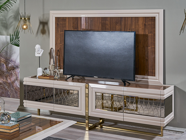 MEUBLE TV LARISSA 2705x475x65+BUFFET MIRROIR+TAM 6 PLACES MINK/CREME