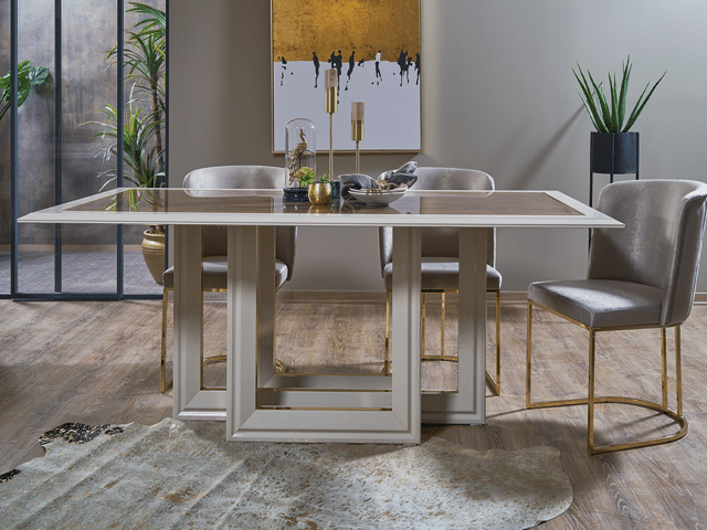 La table à manger, avec ses lignes contemporaines et ses dimensions généreuses, est idéale pour accueillir vos repas en famille ou entre amis. Les chaises en tissu assurent confort et style, tout en s’intégrant parfaitement dans tous types d’intérieurs modernes.