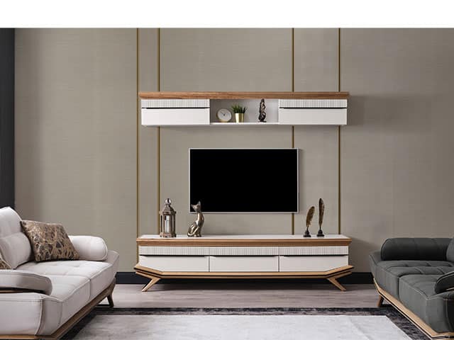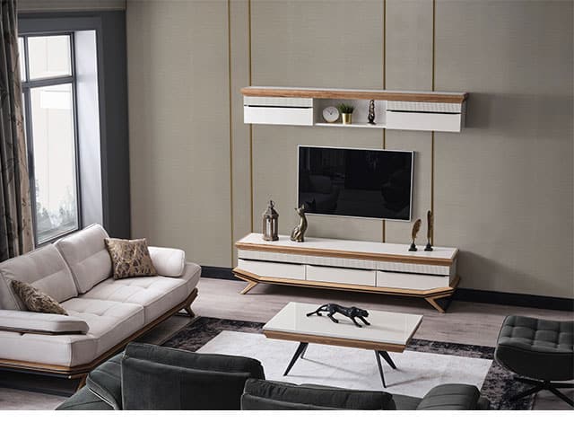 Éléments : Console miroir, Table basse, Meuble TV, Table à manger 6 places