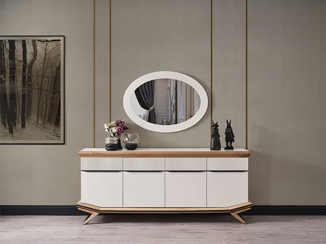 La console miroir de ce pack est à la fois pratique et décorative. Elle permet de poser vos objets du quotidien tout en agrandissant visuellement l’espace grâce à son miroir élégant. Idéale pour l’entrée ou le salon, elle allie style et utilité.