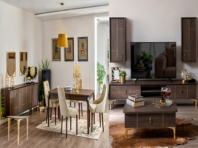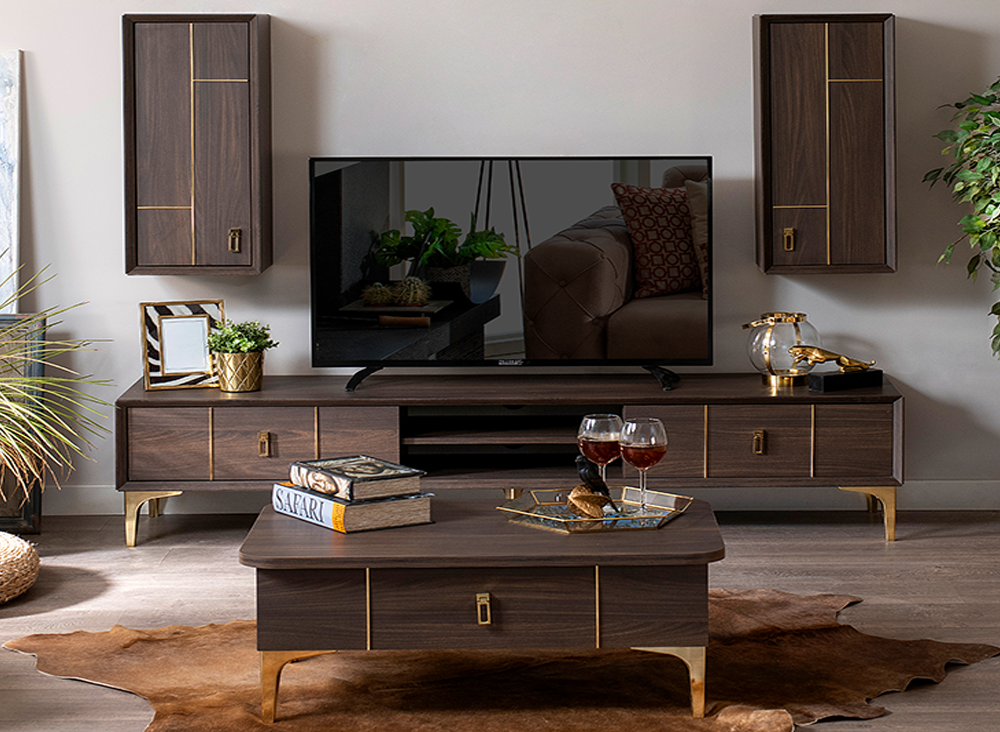 Cette enfilade, composé de 5 Eléments : Meuble TV + Table basse+Table de coin + Buffet + Table à Manger + Chaises (8) saura vous charmer par sa qualité et ses finitions exceptionnelles.