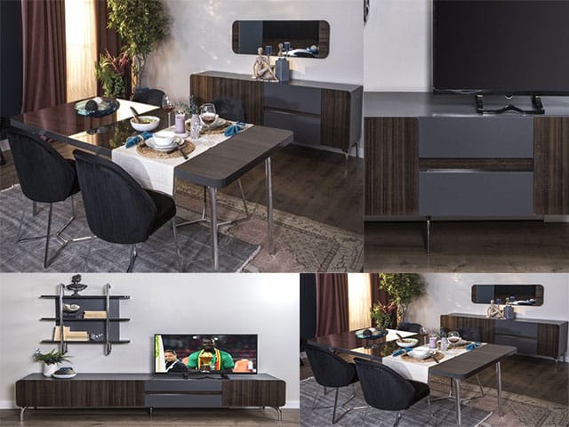 Cette enfilade, composé de 2 Eléments : Buffet Miroir + Table à Manger + Chaises (6) saura vous charmer par sa qualité et ses finitions exceptionnelles.