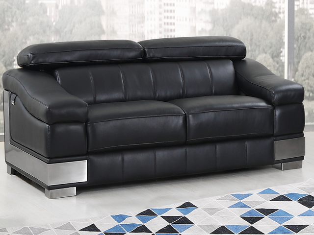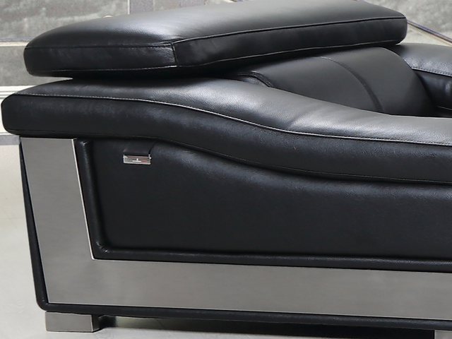 Canapé design épuré et chic en cuir noir et détails chromés.