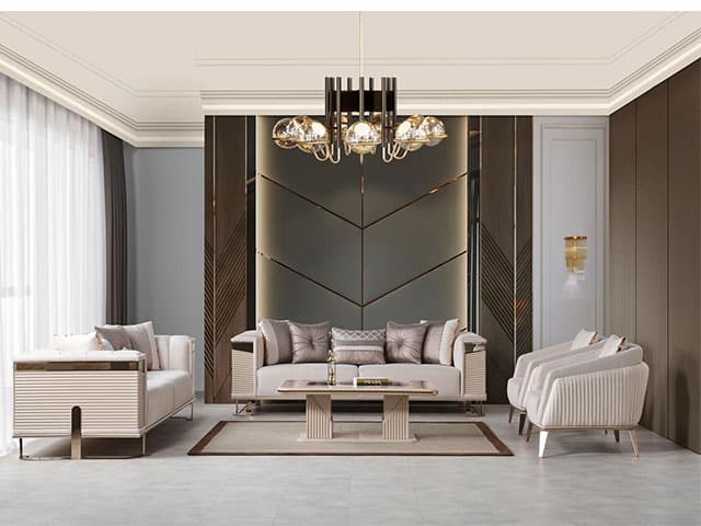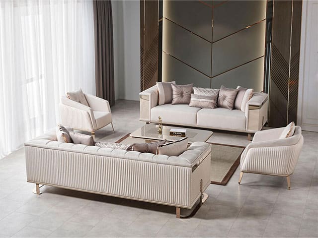 Ce salon en tissu 8 places offre une composition 3+3+1+1 idéale pour accueillir famille et invités. Avec sa teinte beige doré, il apporte une ambiance chaleureuse et élégante à votre intérieur. Conçu pour un usage quotidien, il combine confort, style et praticité