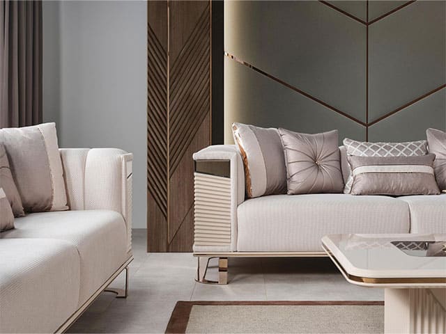 Le salon en tissu 8 places (3+3+1+1) Deluxe est pensé pour créer un espace de vie convivial et harmonieux. Sa structure se compose de deux canapés trois places et de deux fauteuils individuels, permettant une répartition équilibrée dans le séjour selon la configuration de votre pièce.