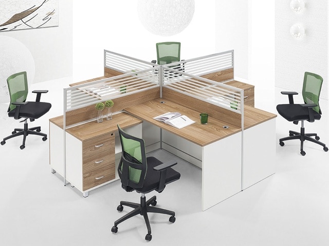 Avec ses dimensions de 2820 × 2820 × 1100 mm, elle permet à quatre utilisateurs de travailler simultanément dans un espace bien structuré, favorisant la concentration et la productivité. Cette station de travail convient aussi bien aux entreprises, administrations, centres d’appel qu’aux espaces de coworking.