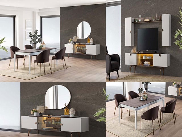 L’ensemble salle à manger Basalto 6 places avec buffet miroir et meuble TV en marron et blanc est conçu pour offrir un aménagement cohérent et fonctionnel de votre espace intérieur.