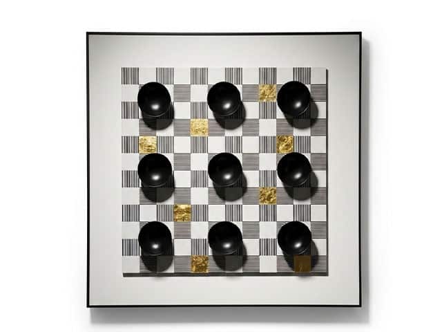 Tableau décoratif au format carré combinant blanc, noir et doré, conçu pour structurer un mur avec une touche contemporaine. Idéal pour un salon, un bureau ou un espace professionnel au Sénégal et à l’international.