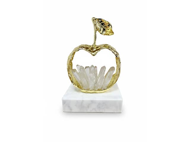 Au cœur de la pomme se trouve un amas de cristaux naturels, vraisemblablement du quartz blanc ou du cristal de roche. Les cristaux, sous forme de prismes hexagonaux transparents et translucides, pointent vers le haut dans différentes directions. Cet élément minéral crée un contraste visuel saisissant entre la pureté brute de la pierre et la rondeur lumineuse du métal doré, tout en captant subtilement la lumière.