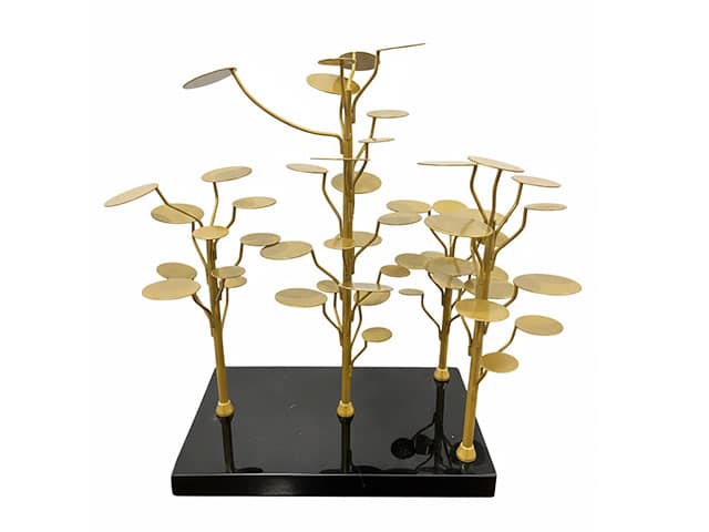 Sculpture “Arbre” Dorée : Une pièce inspirée de la nature, composée de trois structures arbustives aux branches stylisées. Chaque branche se termine par un petit disque plat et circulaire. L’ensemble est réalisé en métal doré mat et fixé sur un socle rectangulaire noir brillant (marbre ou verre laqué), créant un contraste harmonieux avec les autres éléments.