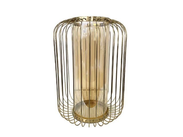 Le vase cylindrique se compose d’un cylindre central en verre teinté ambre ou fumé, idéal pour accueillir des fleurs séchées, des branches décoratives ou une bougie pilier. Le verre est entouré d’une cage métallique dorée, constituée de fines tiges courbées qui se rejoignent en haut et en bas, formant une silhouette élégante rappelant une lanterne contemporaine. Cette structure apporte à la fois protection et effet visuel dynamique.