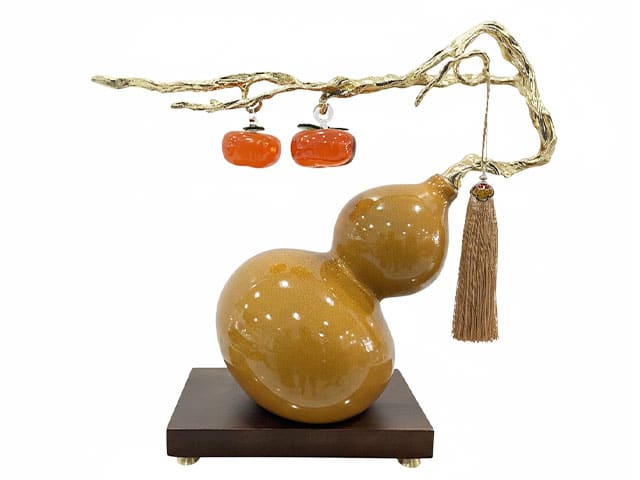 Son design s’inspire de la calebasse traditionnelle en forme de huit, symbole de longévité, de santé et de prospérité dans la culture asiatique. Cette forme centrale en céramique vernissée arbore une teinte ocre ou caramel ambré, lumineuse et chaleureuse, qui capte la lumière et révèle toute la subtilité de son glaçage.