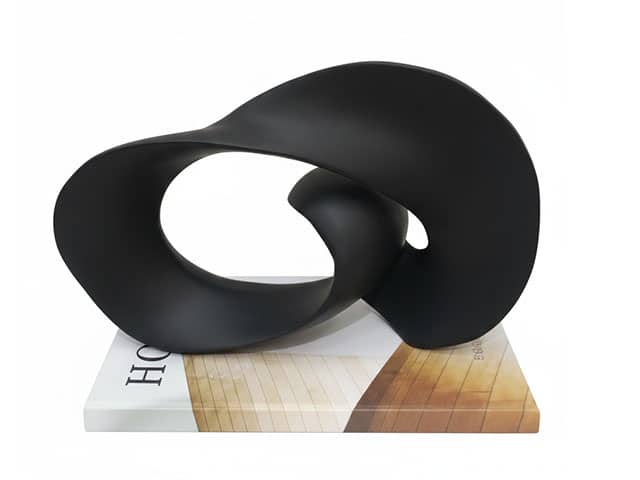 La surface de l’objet présente un fini noir mat profond, qui accentue les ombres et les volumes des courbes, renforçant l’impression de mouvement et de fluidité. Le matériau, probablement en résine, céramique ou métal peint, est parfaitement lisse au toucher, dépourvu d’arêtes vives, et confère à la sculpture un rendu apaisant et raffiné.