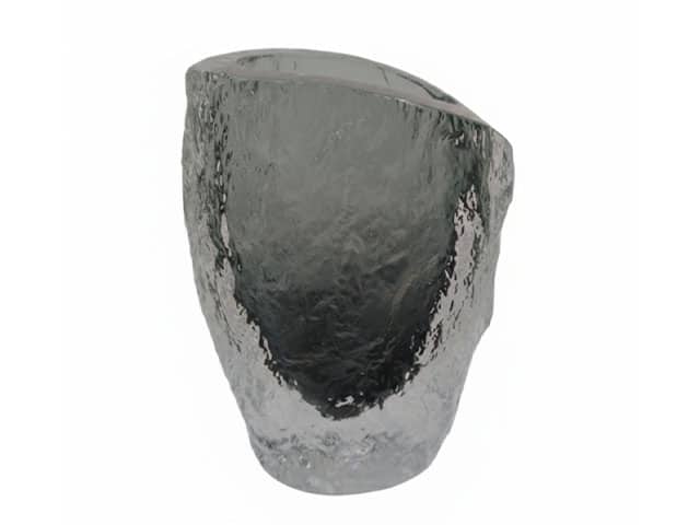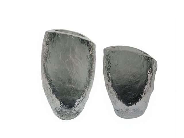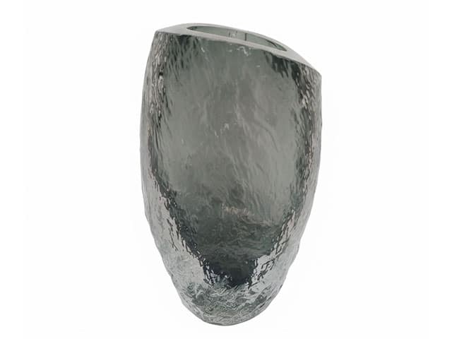 La teinte gris anthracite fumé, oscillant entre argenté et noir profond, accentue cet effet minéral. La densité du verre varie naturellement : plus opaque et intense à la base, elle devient progressivement plus translucide vers le haut, générant une profondeur visuelle élégante et mystérieuse.