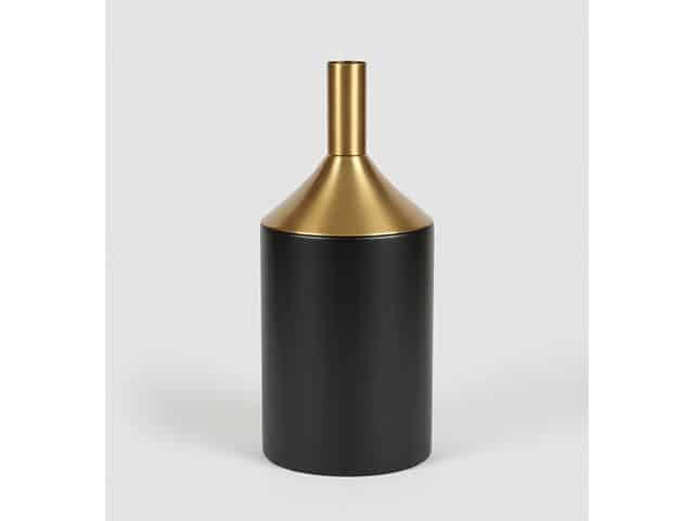 Le corps inférieur, habillé d’un noir mat profond, présente une texture lisse et non réfléchissante qui absorbe la lumière et renforce la sobriété de la pièce. En contraste, la partie supérieure métallique, à la finition dorée satinée type laiton ou or brossé, apporte chaleur et sophistication. Cette surface capte subtilement la lumière et met en valeur les lignes nettes du vase.