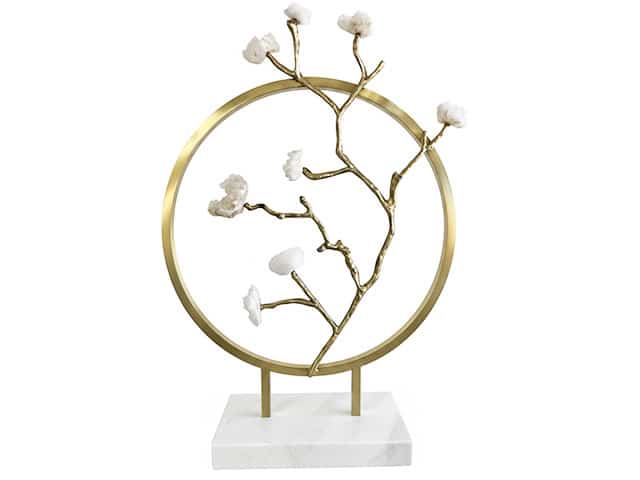 À l’intérieur du cercle, une branche métallique dorée texturée et organique semble jaillir de la base, avec des ramifications qui dépassent partiellement du cadre, créant un effet de relief et de profondeur. Huit amas de cristaux de quartz blanc brut sont fixés aux extrémités des branches, simulant des bourgeons ou des fleurs de pierre, apportant lumière et éclat naturel à la sculpture.