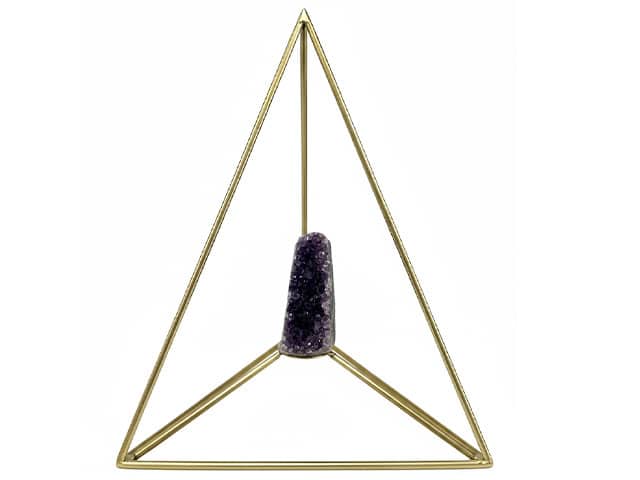 L’objet se distingue par une pyramide filaire en métal doré, à la finition laiton brossé. Cette armature légère et ouverte forme une pyramide à base carrée, où chaque arête converge avec précision vers un sommet pointu, créant un effet visuel aérien et graphique. La structure laisse apparaître l’espace intérieur, mettant en valeur l’élément central avec élégance.