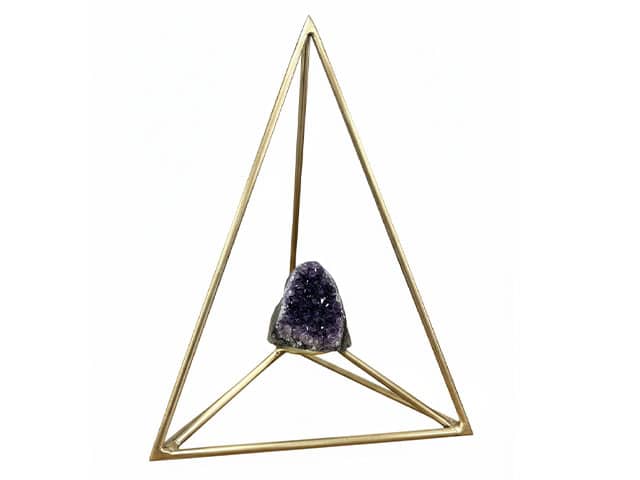 Au centre, une druse d’améthyste naturelle est mise en valeur. La pierre, avec sa forme de dôme triangulaire arrondi, rappelle la géométrie de la pyramide et crée un contraste harmonieux entre métal doré et violet profond du cristal. Le cœur du cristal révèle des facettes violettes intenses, tandis que la bordure extérieure présente la gangue grise naturelle, apportant une touche brute et minérale à l’ensemble.