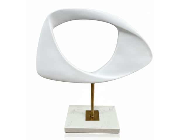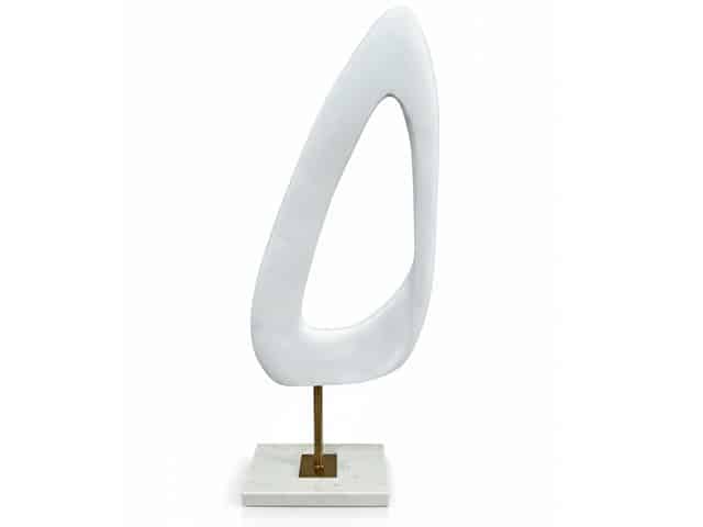 La sculpture horizontale (HX1668-L) adopte une silhouette étirée et asymétrique, rappelant un galet poli par l’eau ou un œil abstrait évidé. Malgré son volume généreux, elle repose avec élégance sur une tige centrale fine, offrant un contraste subtil entre la masse de la forme et la délicatesse du support.