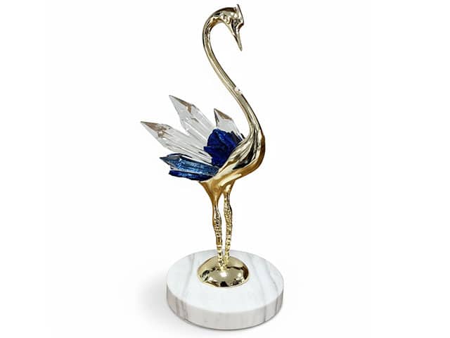 L’élément distinctif réside dans les ailes ornées de cristaux. Chaque statuette est sublimée par des grappes de quartz finement travaillées : l’une associe des cristaux transparents à des nuances bleu saphir profond, tandis que l’autre se distingue par une composition entièrement translucide. Ce jeu de couleurs et de transparence apporte profondeur, éclat et sophistication.