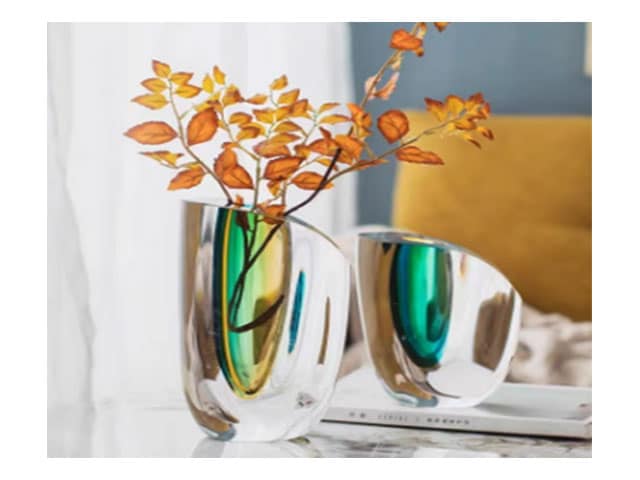 La technique sommerso utilisée pour le cœur des vases offre un dégradé chromatique captivant, allant du vert émeraude profond à un jaune ambré lumineux, comme une goutte de lumière suspendue dans la matière. L’épaisseur du verre et sa transparence créent des reflets subtils et un effet de profondeur, donnant l’impression que les couleurs flottent à l’intérieur de chaque vase.