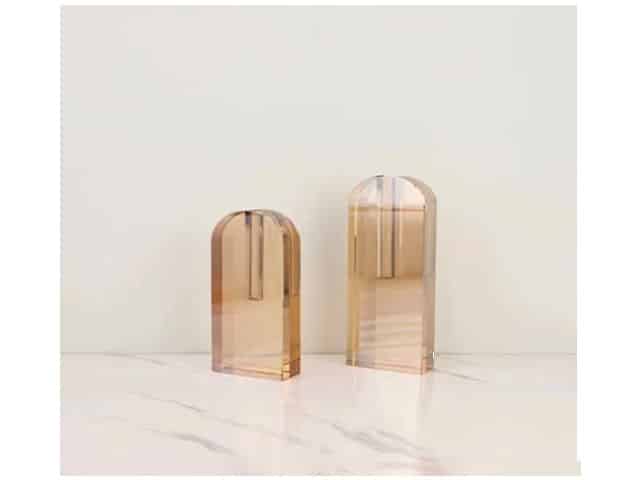Chaque vase repose sur une base rectangulaire stable et s’achève par un sommet arrondi en demi-cercle, créant un équilibre visuel harmonieux. La transparence de la matière, qu’il s’agisse d’acrylique épais ou de résine cristalline, laisse passer la lumière et génère un jeu de reflets et de profondeur qui attire le regard.