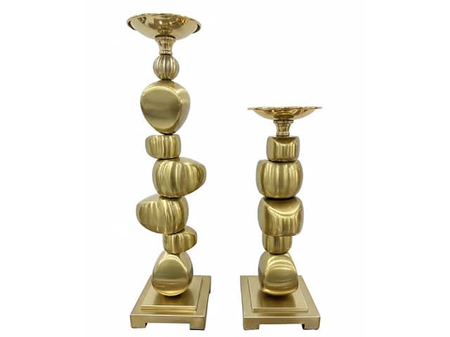 Chaque bougeoir se compose d’une succession de formes organiques lisses et asymétriques, empilées verticalement à partir d’une base carrée solide. L’ensemble évoque un équilibre naturel, presque méditatif, où chaque élément semble délicatement posé sur le précédent, créant une silhouette fluide et sculpturale.