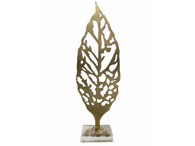 Réalisées en métal à finition dorée Z, les feuilles présentent un aspect brossé ou mat, offrant un rendu luxueux tout en restant sobre et intemporel. La texture métallique capte la lumière de manière douce, mettant en valeur les nervures et les découpes sans excès de brillance.