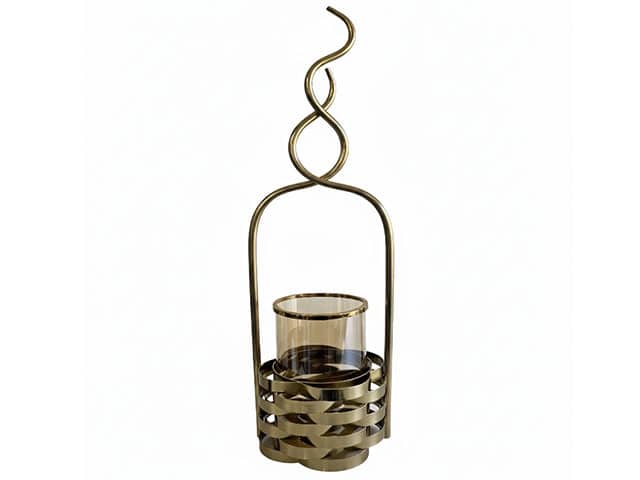 Au cœur de chaque base se trouve un cylindre en verre teinté, de couleur ambre ou fumée. Conçu pour accueillir une bougie pilier ou une bougie chauffe-plat, ce récipient diffuse une lumière douce et enveloppante une fois allumé. Le rebord supérieur du verre est délicatement souligné par une bordure métallique dorée, rappelant l’éclat du métal et renforçant l’harmonie visuelle de la pièce.