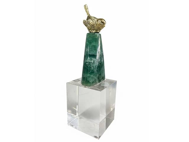 Chaque vase est surmonté d’un petit oiseau en métal doré finement ciselé, la queue relevée, symbolisant légèreté et grâce. L’oiseau repose sur un pilier pyramidal tronqué en pierre verte naturelle – fluorite ou quartz vert – révélant des marbrures uniques et des variations de transparence qui apportent profondeur et caractère à l’ensemble.