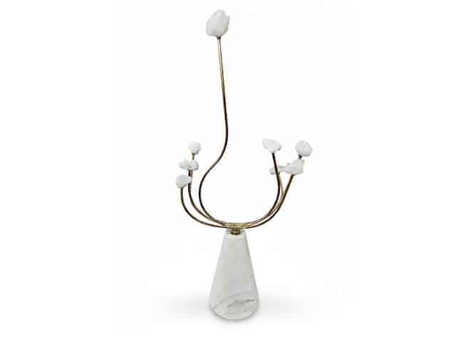 À partir d’un point central unique émergent six tiges métalliques dorées, dont la disposition crée un mouvement fluide et organique. Contrairement à une composition strictement verticale, les tiges se déploient d’abord de façon plus horizontale avant de remonter délicatement, formant une courbe en éventail évoquant une plante stylisée ou un candélabre contemporain. Une tige centrale, nettement plus haute, accentue la dynamique ascendante de l’ensemble et renforce l’asymétrie maîtrisée de la pièce.