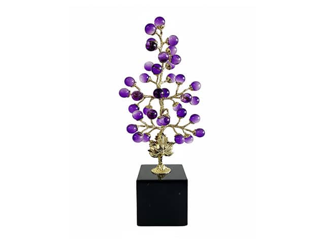 La pièce se distingue par ses « fruits » améthyste, composés de multiples sphères translucides en verre ou résine. Les tons varient du violet profond au lilas clair, créant un jeu scintillant et vivant qui capte la lumière et apporte un accent coloré raffiné.