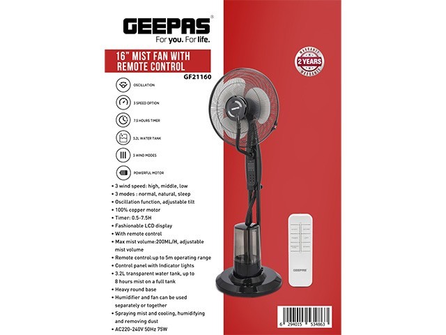 VENTILATEUR BRUMISATEUR 16″ 3.2L GEEPAS GF21160 NOIR AVC TELECOM RECO